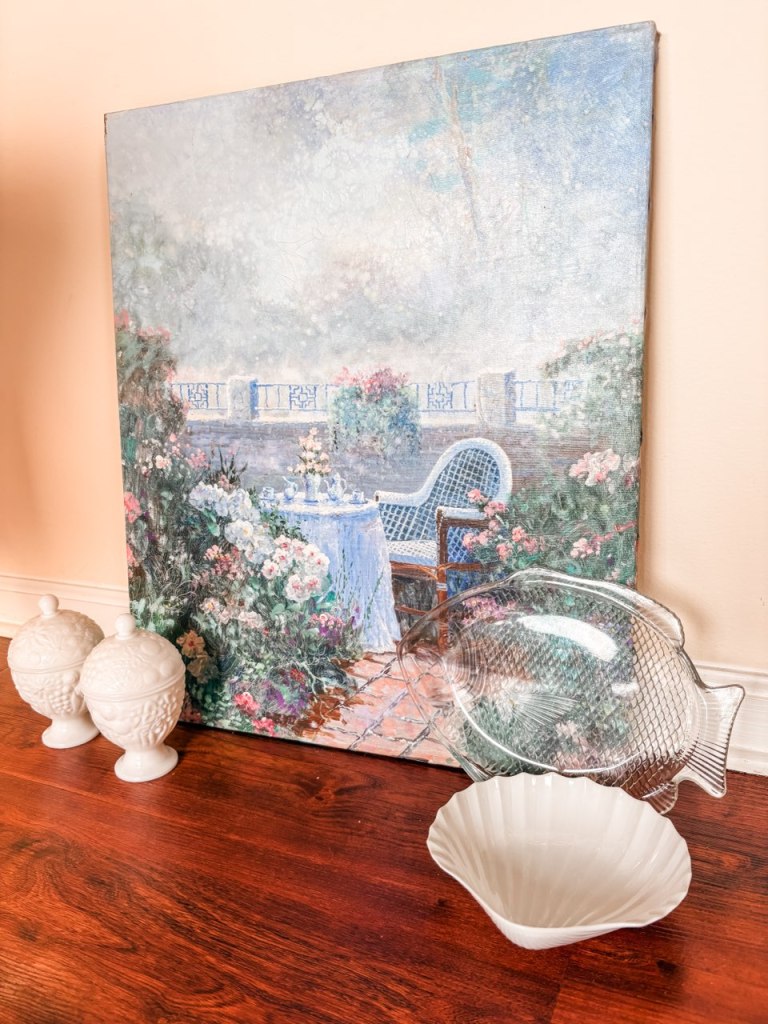 The haul included a still life painting, a fish platter, a seashell dish, and two milk glass candy jars. Fish were so in this summer, so I knew she would love it. It could be used as a tray for a coffee table, a catchall dish for keys, or a serving plate. I loved that the seashell was a clean and crisp white. It’s coastal without screaming beach, just what my sister asked for. As another versatile catchall item, I envisioned it in the bathroom to hold extra hand towels.